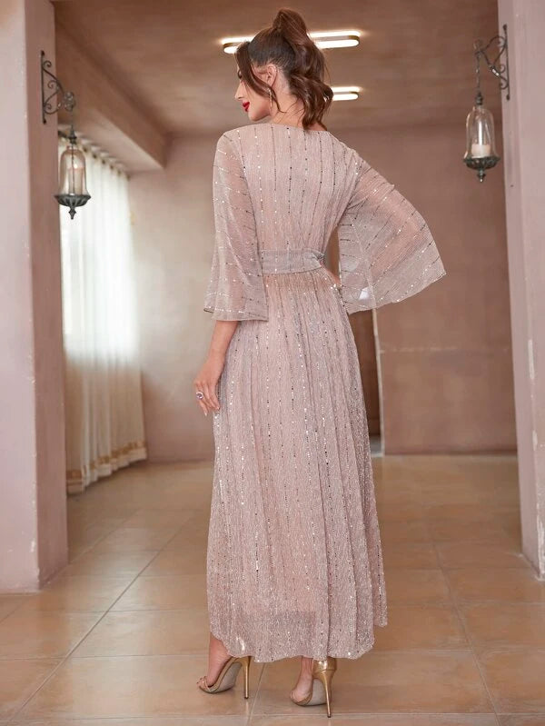 צעד אל מרכז הבמה עם שמלת פאייטים עם שרוולי פלונס וחגורה בגוון אפרסקי יפהפה. הפריט המרהיב הזה מעוצב לאישה המודרנית שרוצה לעשות רושם בכל מסיבה או אירוע מיוחד. עם סילואט A-line מחמיא ופאייטים מפוארים, השמלה הזו לא רק מדגישה את הדמות שלך אלא גם מוסיפה נגיעה של זוהר למלתחה שלך. בין אם את רוקדת כל הלילה או נהנית מארוחת ערב אלגנטית, השמלה הזו היא החברה המושלמת שלך.